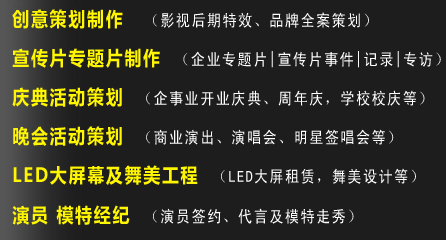智慧力——創(chuàng)作團(tuán)隊 創(chuàng)意總監(jiān)——創(chuàng)意來自生活,高于生活 美術(shù)指導(dǎo)——身手敏捷,思想敏銳,具有獨(dú)特的美術(shù)嗅覺 資深策劃——思維縝密而又膽識過人,常常給人意外之喜 經(jīng)典影視.品牌傳播,采用國際化的Team作業(yè)模式——